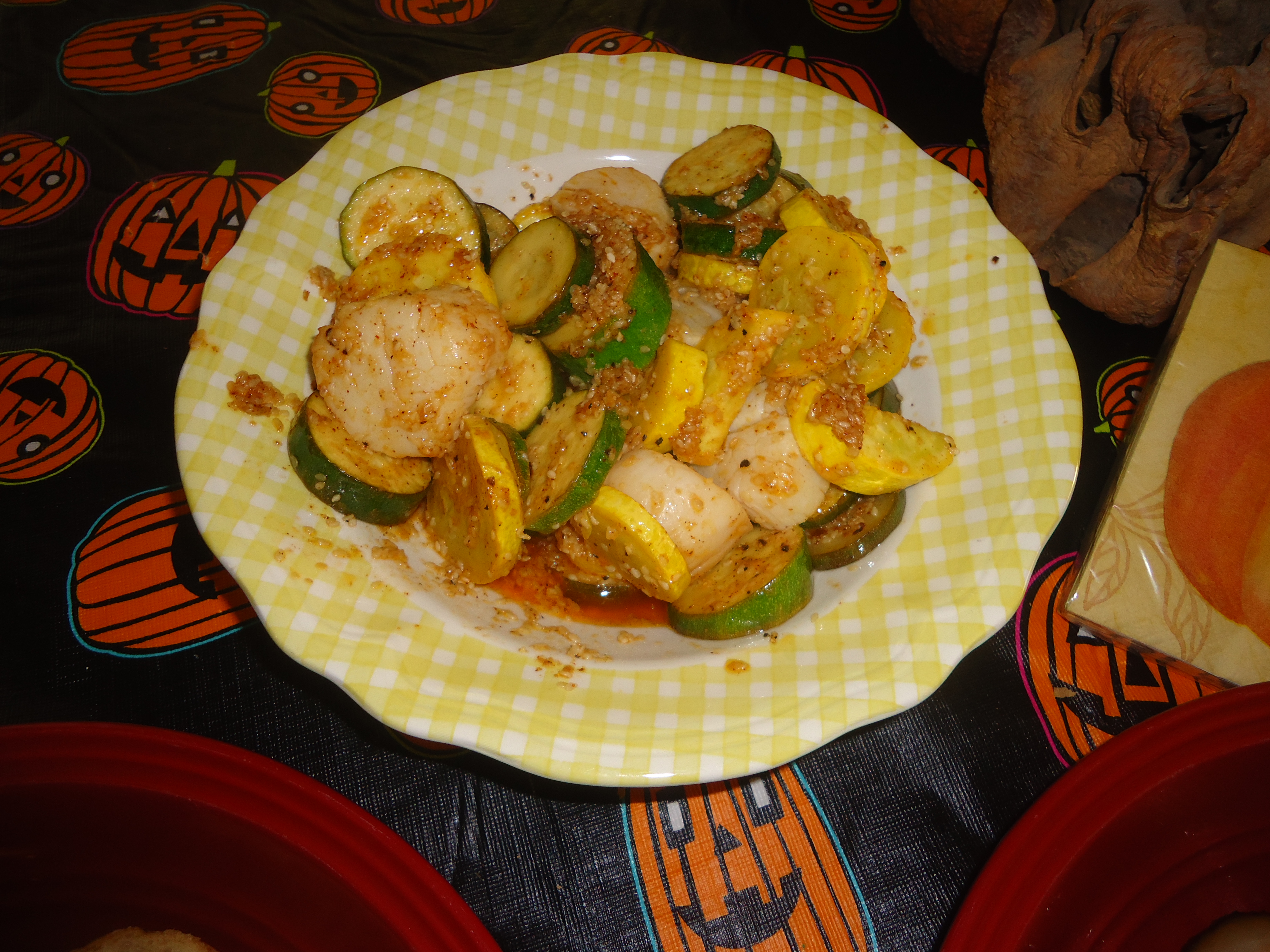 Before I looked up this song and after I went shopping and put my grocers in the car seeing a strange man take a picture of me; I went crazy in the kitchen. I cooked up some scallops , sesame seeds, yellow squash and zucchini.