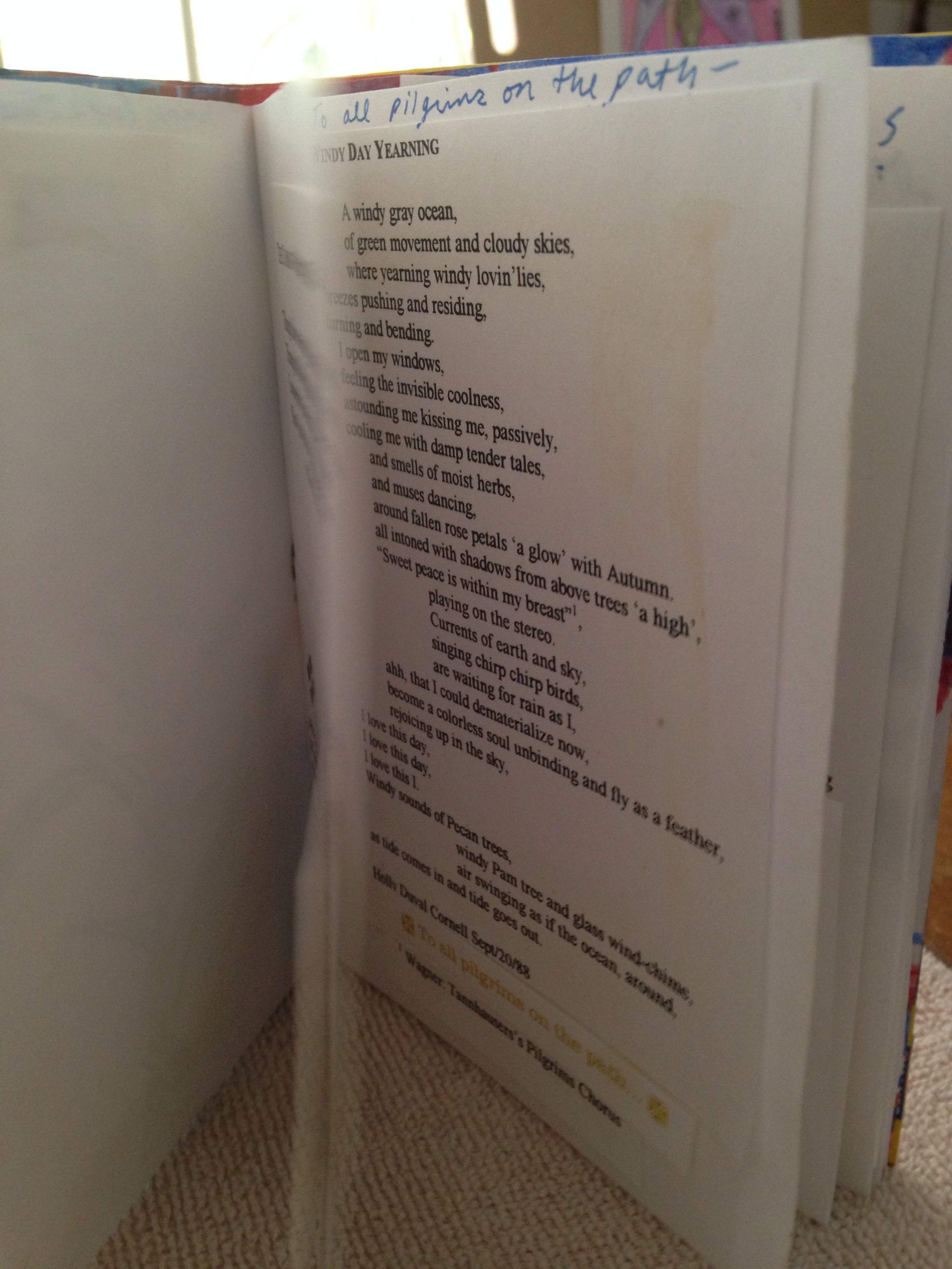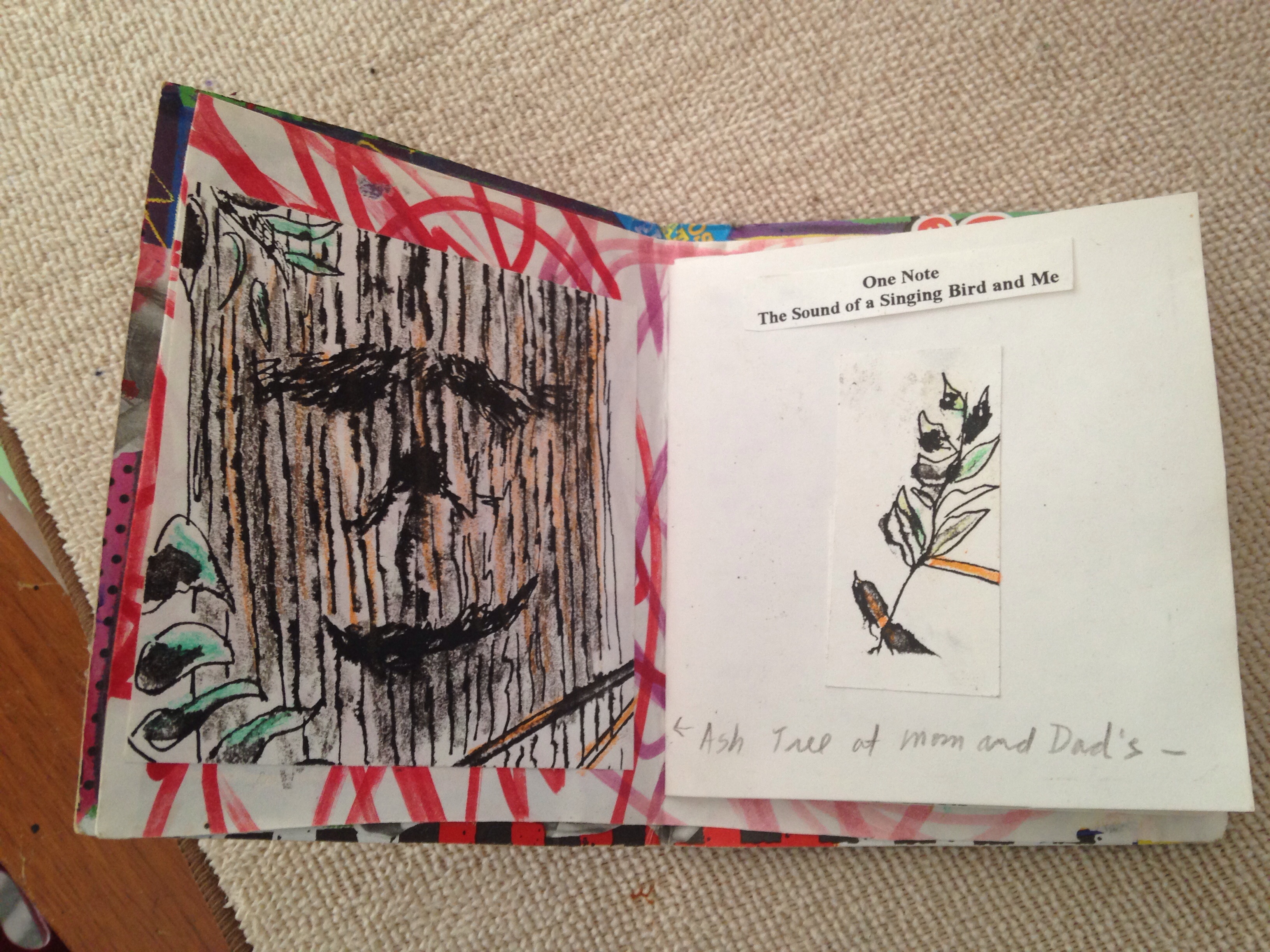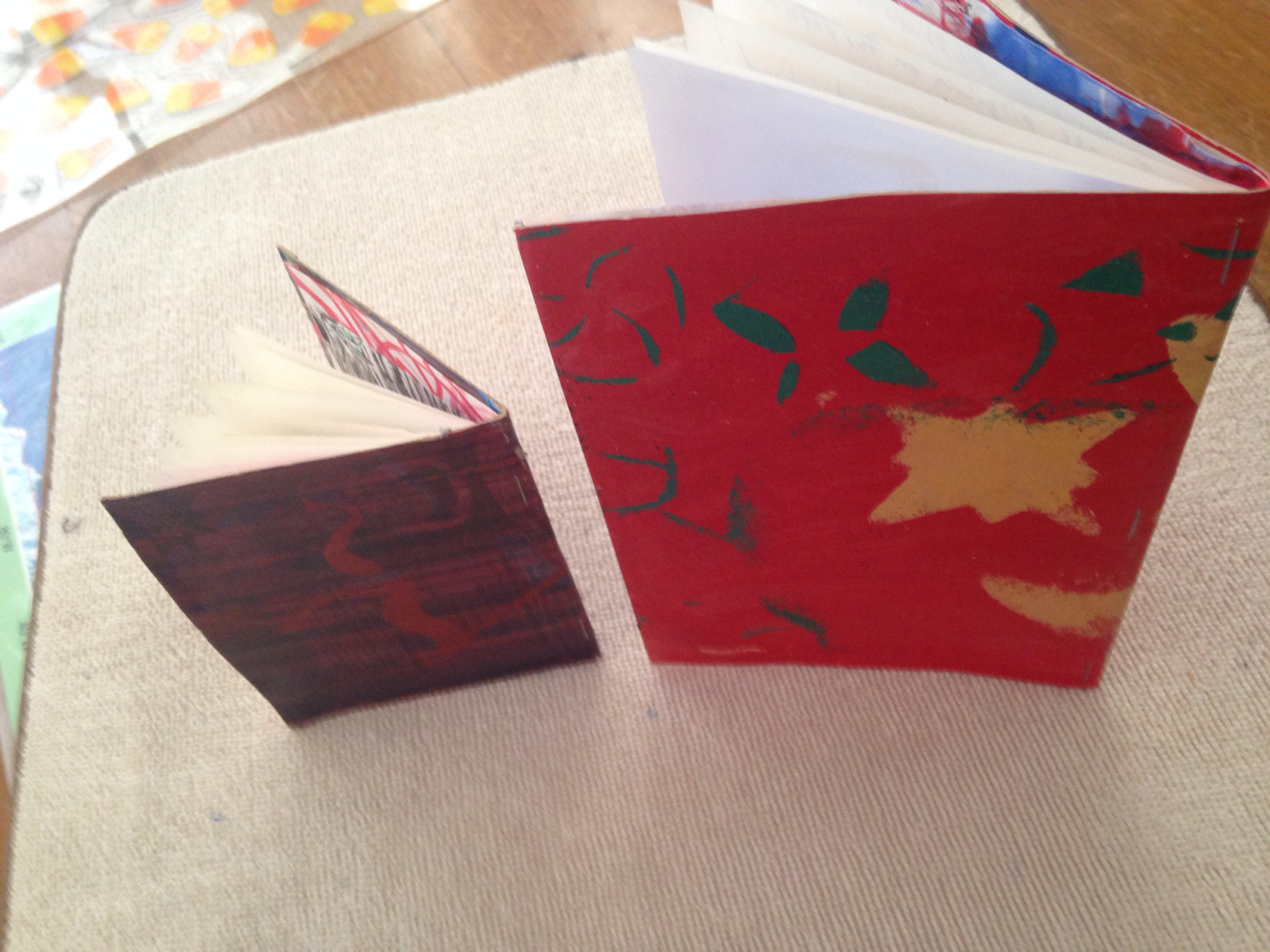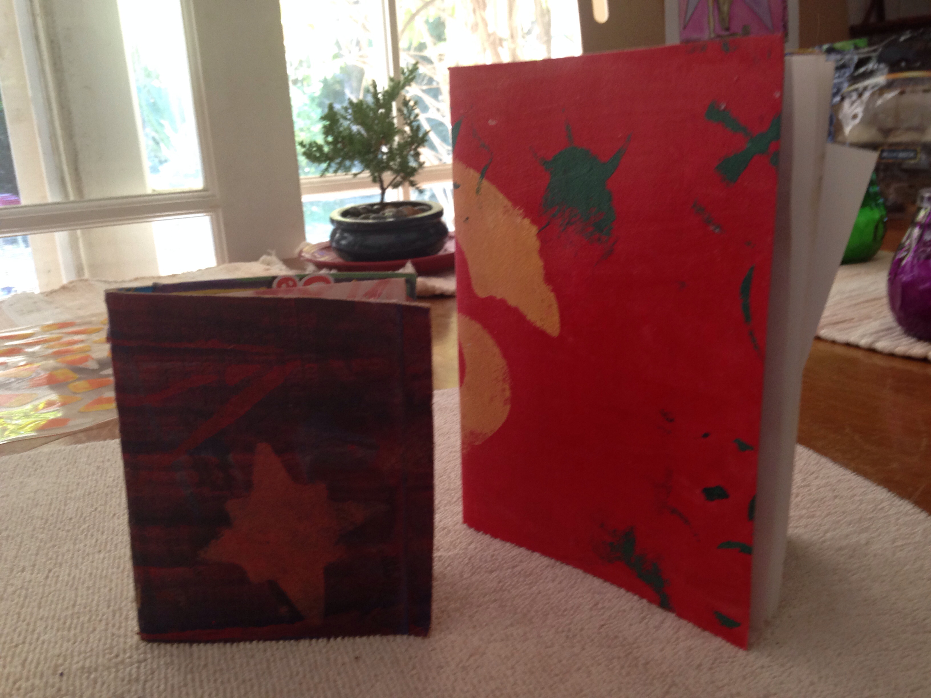Filling the pages with my watercolor paintings and typed poems, son and I had fun putting them together. We painted the covers with acrylic paint and mod podge, and correlated the inside papers, and stapled this all together.